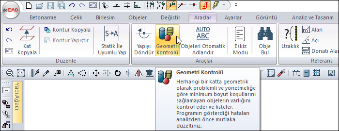 Geometri kontrolü, herhangi bir katta geometrik, yerleşim ve boyut olarak problemli objelerin varlığını kontrol etmek için kullanılır. Kontrol sonunda ekranda sonuçlar listelenir ve söz konusu objeler kullanıcı tercihlerine göre otomatik seçilir.