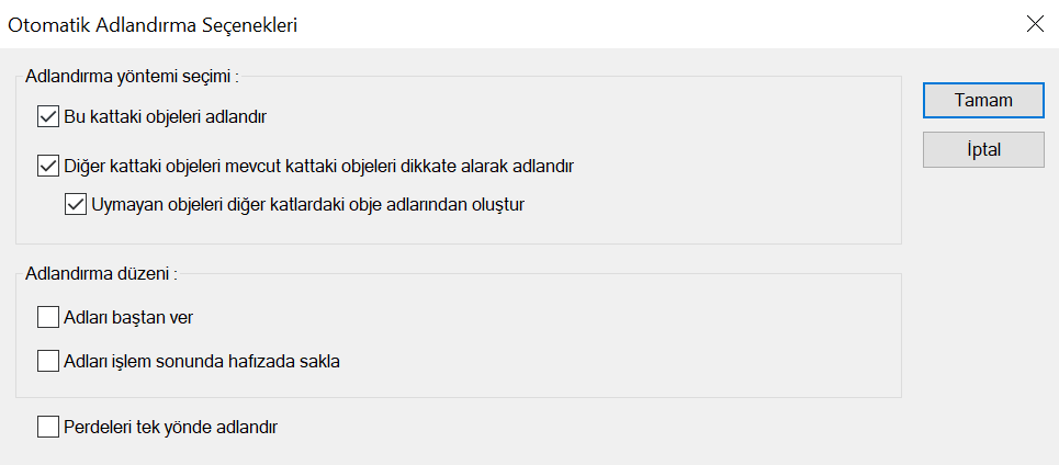 Diğer kattaki objeleri mevcut kattaki objeleri dikkate alarak adlandır 'ı işaretleyin.