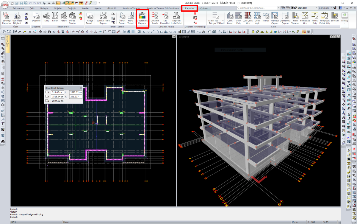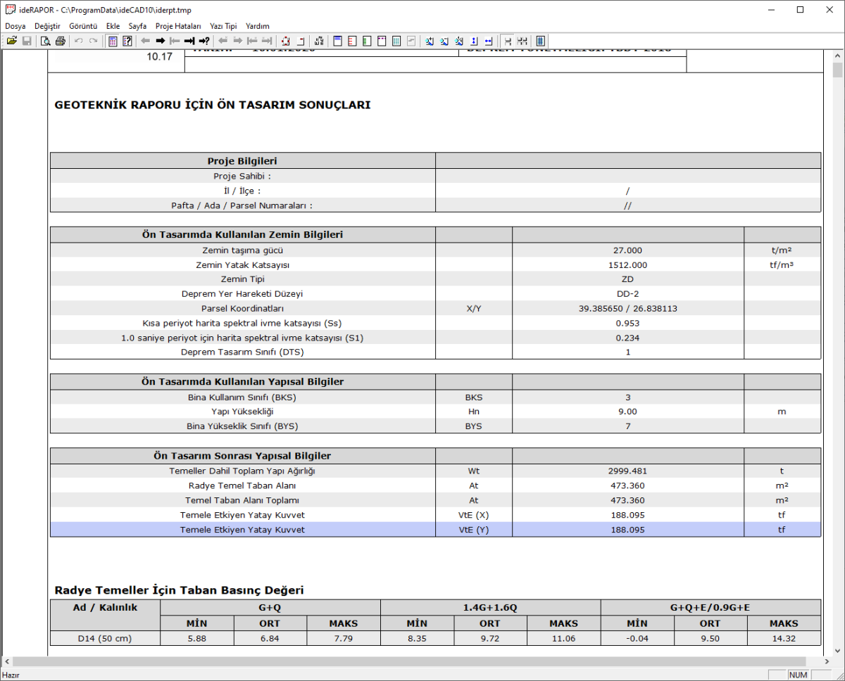 Statik projede geoteknik raporu hazırlamak için Raporlar başlığı altındaki Temel-Zemin bölümünde bulunan "Geoteknik Raporu" komutu kullanılır.