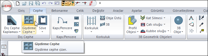 Ribbon menü Cephe sekmesi Dış Cephe başlığı altından ulaşabilirsiniz.