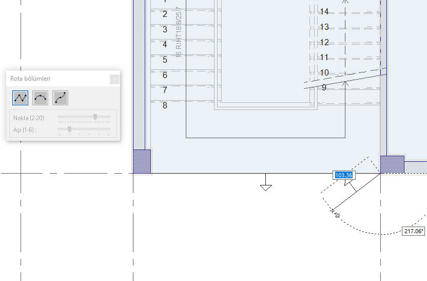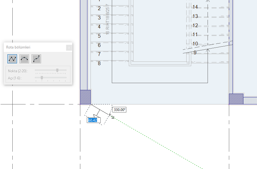 Rota Bölümleri toolbarında giydirme cephe hattını düz, dairesel ve eğri formda çizmeyi sağlayan ikonlar bulunur.