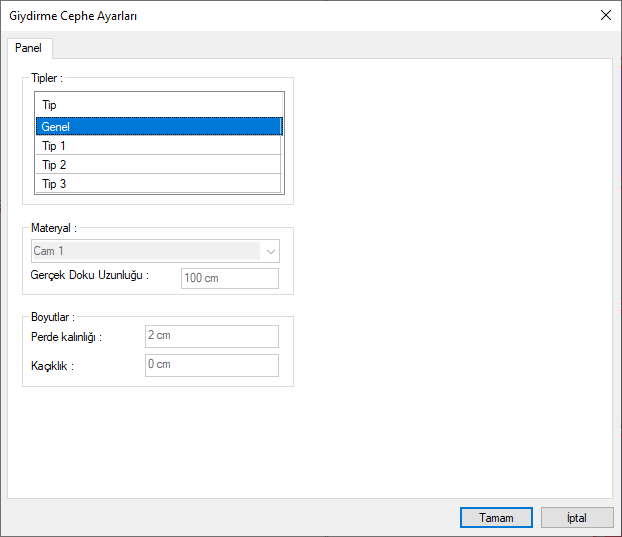 Açılan giydirme cephe ayarları diyaloğundan genel, tip 1, tip 2 ve tip 3 seçeneklerinden birini seçin.