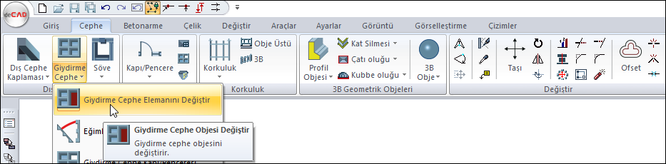 Giydirme cephe elemanını değiştir komutunu tıklayın.