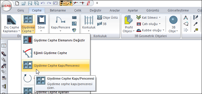 Giydirme Cephe Kapı/Penceresi komutu ile giydirme cephe üzerinde kapı ya da pencere tanımlanır. Giydirme cephe üzerinde tanımlanacak kapı/pencere, kapı/pencere ayarlarında varsayılan olarak seçilmiş kapı/pencere olacaktır. Tanımlandıktan sonra ayarlarından tipi değiştirilir.