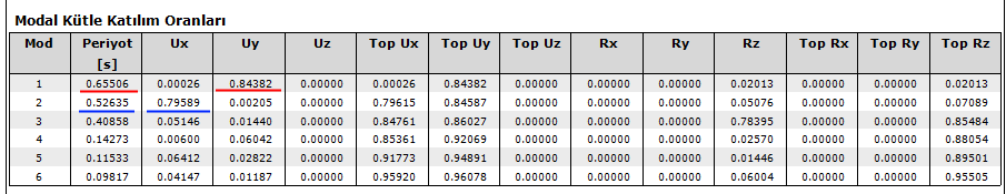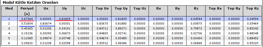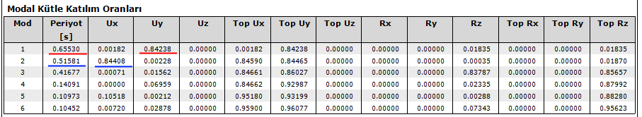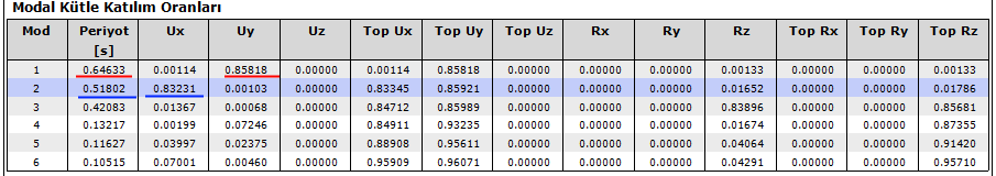 Dinamik analizden, E1 , E2 , E3 ve E4 yüklemelerinde kendi yönüne uyumlu en büyük modal katılım oranları okunarak x ve y yönü için ’er adet hakim titreşim periyodu belirlenir. X yönü için belirlenen 4 adet periyoddan en büyük kütle katılım oranına sahip olan seçilir. Aynı işlem Y yönü içinde yapılır.