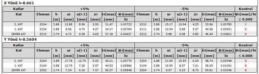 X yönü 1. Kat -%5 -> 0.661 * 40.56 /2880 = 0,00931 > 0.008 sağlanmıyor