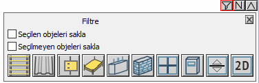 3B perpektif penceresinin sağ üst köşesinde bulunan en soldaki filtre ikonu objeleri kapatıp açmak için kullanılır. İkon tıklandığında Filitre diyaloğu açılır.