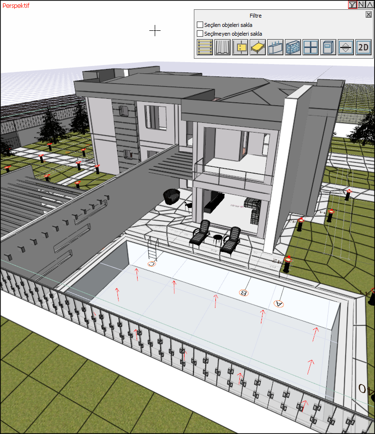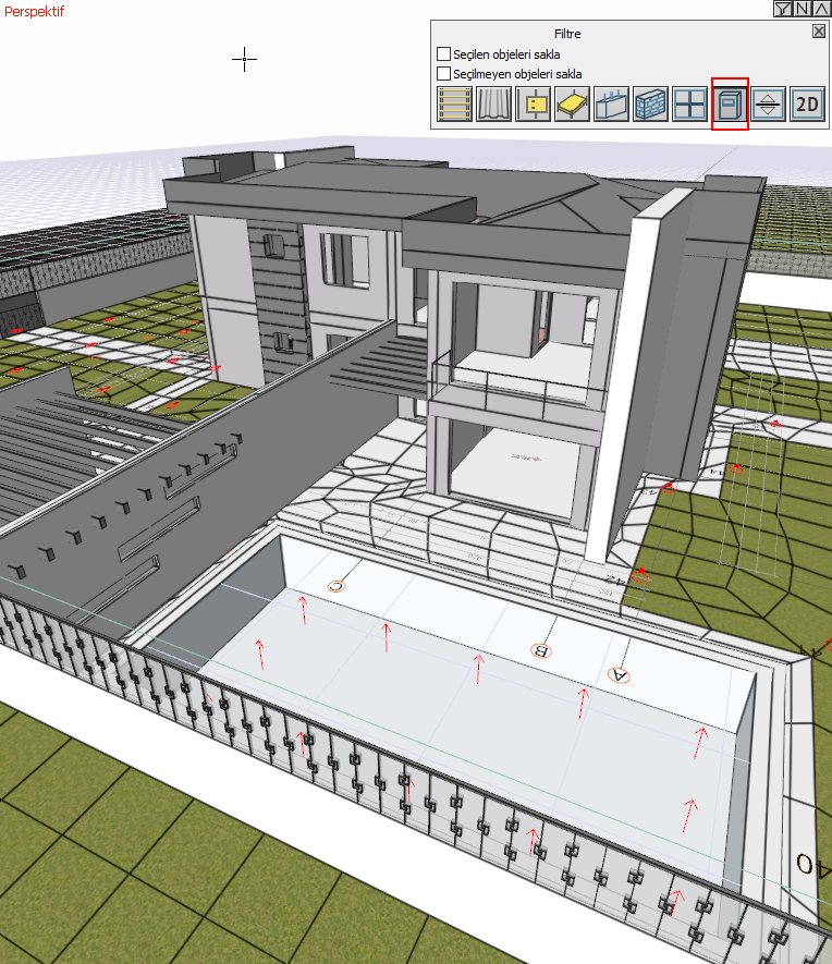 Ayrıca perspektif ekranda sağ tuş menüden Objeleri Sakla/Filtrele komutuyla seçilen objeleri 3B görünümde kapatabilirsiniz.
