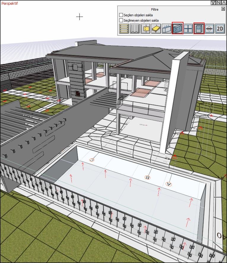3 boyutlu ekranda model üzerinde daha verimli çalışmak için filtreler tasarlanmıştır. Obje filtreleri ile model görünümünde seçilen ya da işaretlenen objeler gizlenirken, aktif olarak çalışılan kat dışındaki katları gizleme imkanı da bulunmaktadır. Ayrıca tam ekran moduna geçip, ekranın tamamı perspektif penceresine ayrılarak model incelenebilir.