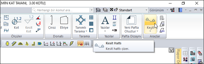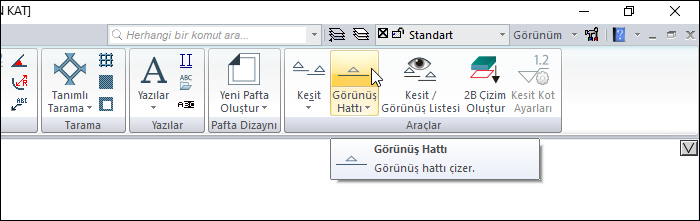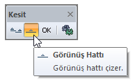 Ribbon menü çizimler sekmesi Araçlar başlığı altında yer alan Kesit komutuna girdikten sonra açılan Kesit toolbarından Görünüş Hattı komutuna ulaşabilirsiniz.