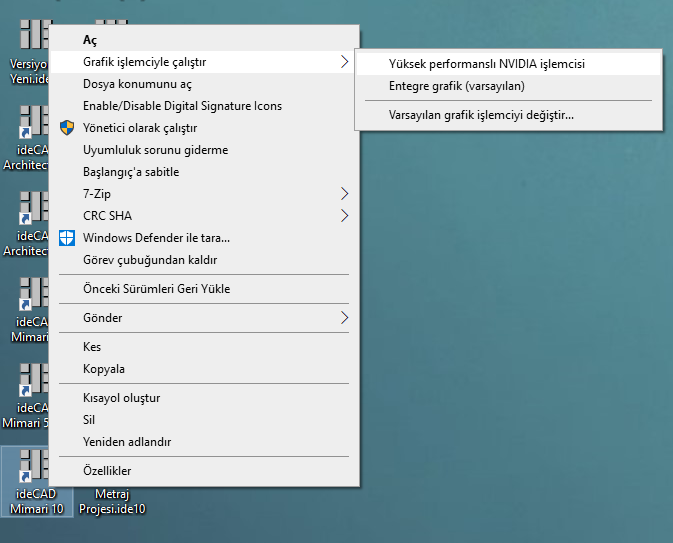 Bunun için ideCAD çalıştırılırken sağ tuş menü ile daha yüksek performanslı ekran kartını aktif hale getirmek sorunu giderecektir.