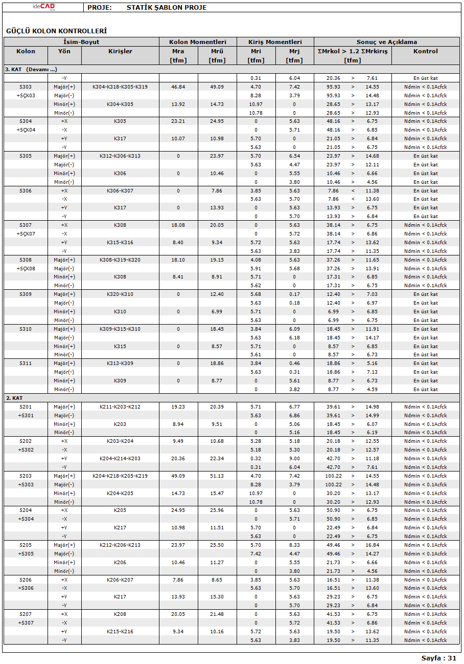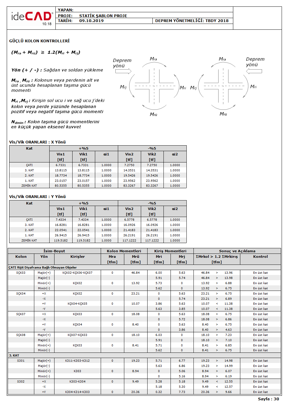 Düğüm noktasına birleşen kolonların her ikisinde de Nd≤ 0.10 Ac fck olması durumunda veya tek katlı binalarda ve çok katlı binaların en üst katındaki düğüm noktalarında veya kirişlerin saplandığı perdenin zayıf doğrultuda kolon gibi çalışması durumunda, yukarıdaki koşulun sağlanmadığına bakılmaz. Raporda kontrol sütununda Nd≤ 0.10 Ac fck veya En üst kat terimleriyle bilgi yazılır.