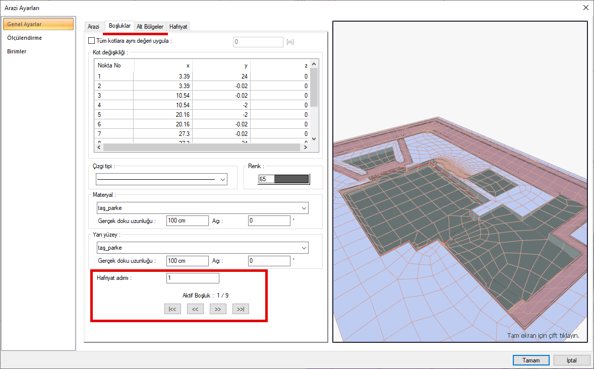 Arazinizde yer alan boşluk, plato ve alt bölge ayarlarında yer alan hafriyat bölümüyle ilgili arazi alt objesine istediğiniz adımı verebilirsiniz. Hafriyat adımlarını belirleyerek her alt obje için hafriyat miktarını görebilirsiniz.