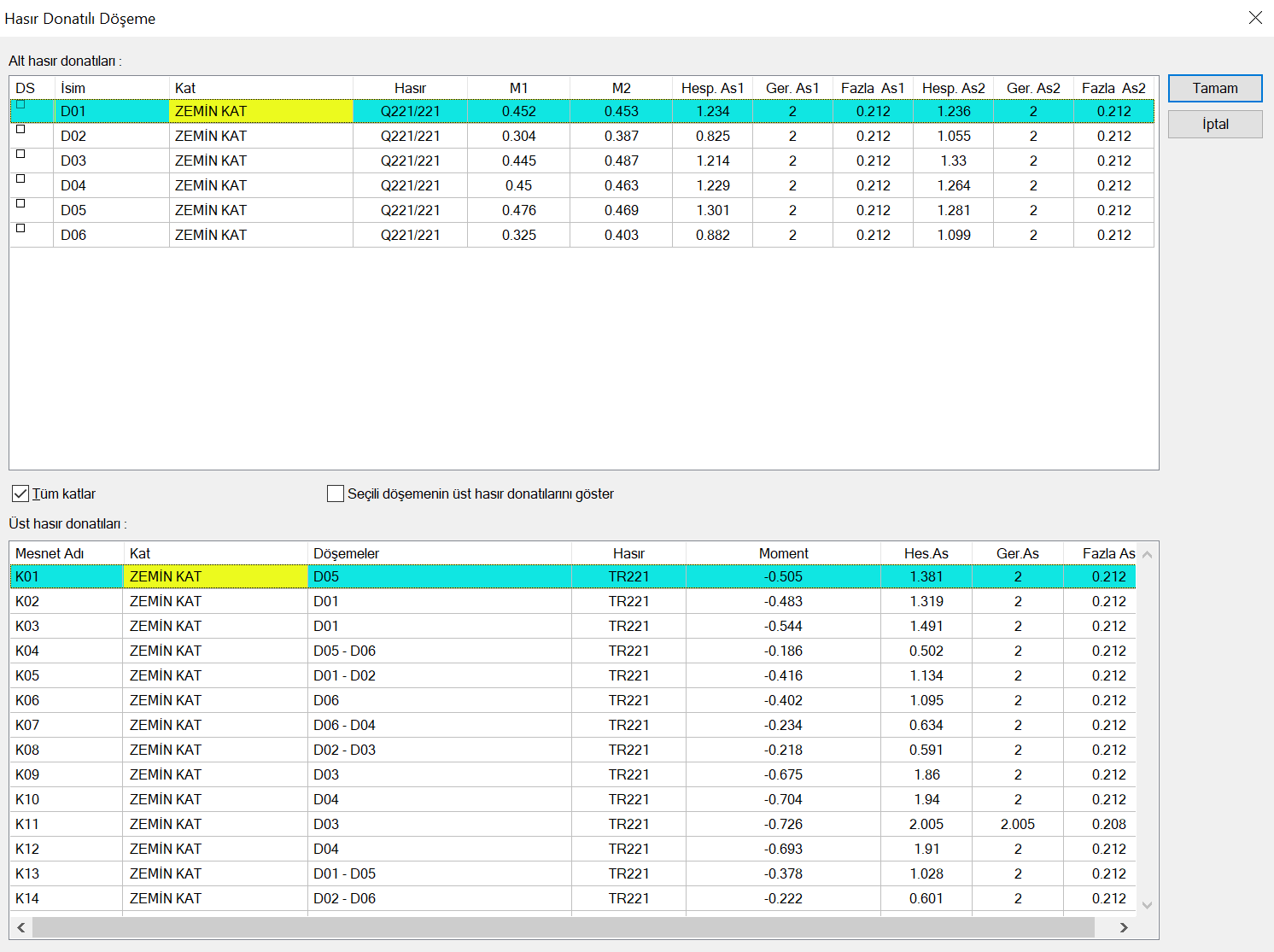 Seçili döşemelerin üst hasır donatılarını göster ![]() İşaretlenen herhangi bir döşeme veya döşemeler grubu için, döşemelerin üstünde bulunan donatıları listeler. Aksi durumda tüm döşemelerin listesi verilir. |
