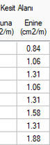 Aralık enine ![]() Hasır donatının enine aralık değeri görünür. Hücreye tıklanarak değişiklik yapılır. |