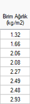 Birim ağırlık ![]() Hasır donatının bir birim alandaki ağırlığı görünür. |