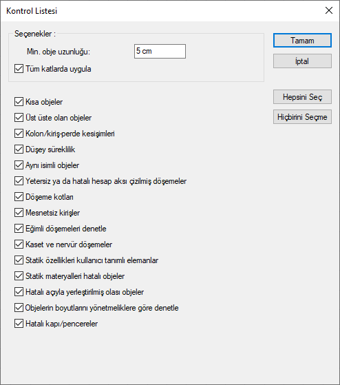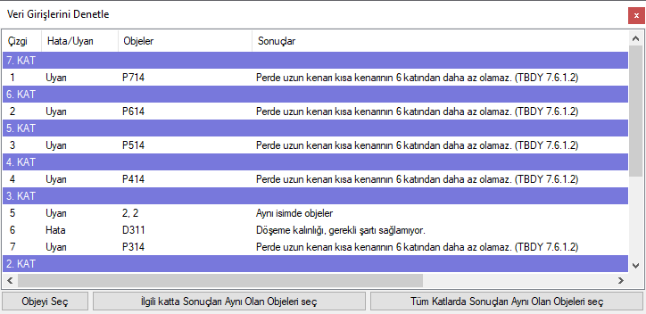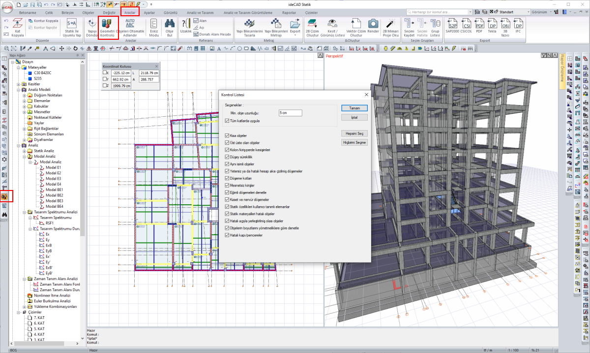 ”Araçlar/Geometri Kontrolü” veya sol toolbardan ”Geometri Kontrolü” ikonu tıklanarak projede herhangi bir kat için veya tüm proje için hata/uyarı denetimi yapılır.