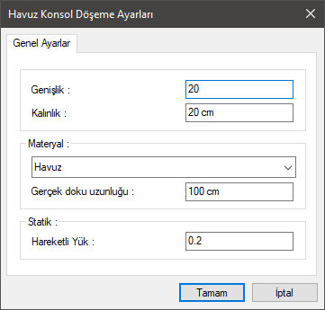 Havuz Konsol Döşeme Ayarları diyaloğu açılacaktır. Mevcut havuz konsol döşemenize ait özellikler diyalogda yer alır.