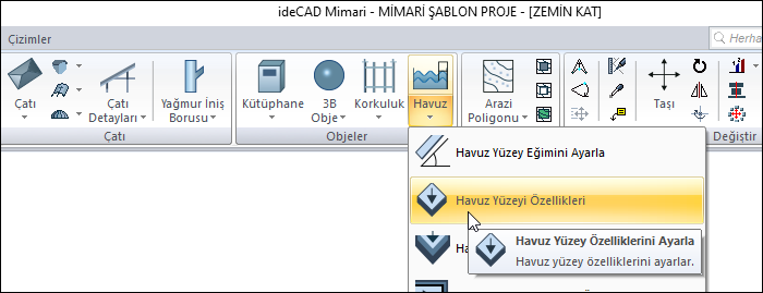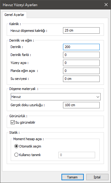 Havuz Yüzeyi Özelliklerini Ayarla komutu ile havuz oluşturulduktan sonra havuzun taban döşemesinin kalınlık, derinlik, eğim, su seviyesi vb. özellikleri ayarlanır.