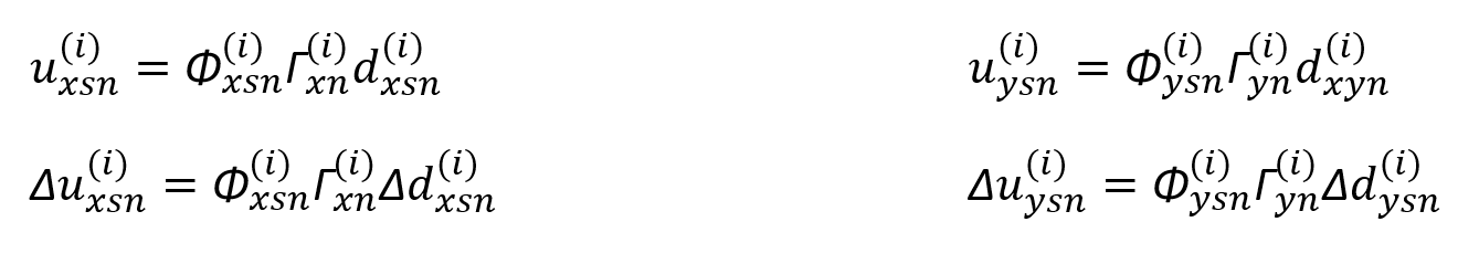 ( X ) ve ( Y ) deprem doğrultularında i 'inci itme adımında, tipik bir n 'inci doğal titreşim modu için taşıyıcı sistemin herhangi bir (s) düğüm noktasına ait yerdeğiştirme artımları, Δuxsn(i) ve Δuysn(i) ile yer değiştirme değerleri, uxsn(i) ve uysn(i) aşağıdaki bağıntılar ile hesaplanabilir.