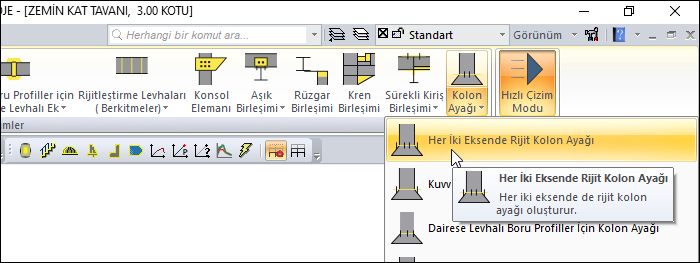 Çelik menüsünden Her İki Eksende Rijit Kolon Ayağı satırını tıklayın.
