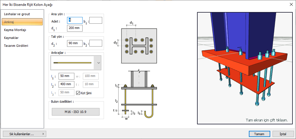 Ankrajlar ![]() ![]() Listeden ankraj tipi seçilir. Ankraj boyutları değerler girilerek belirlenir. Girilecek değerler şematik çizimde gösterilmektedir. |