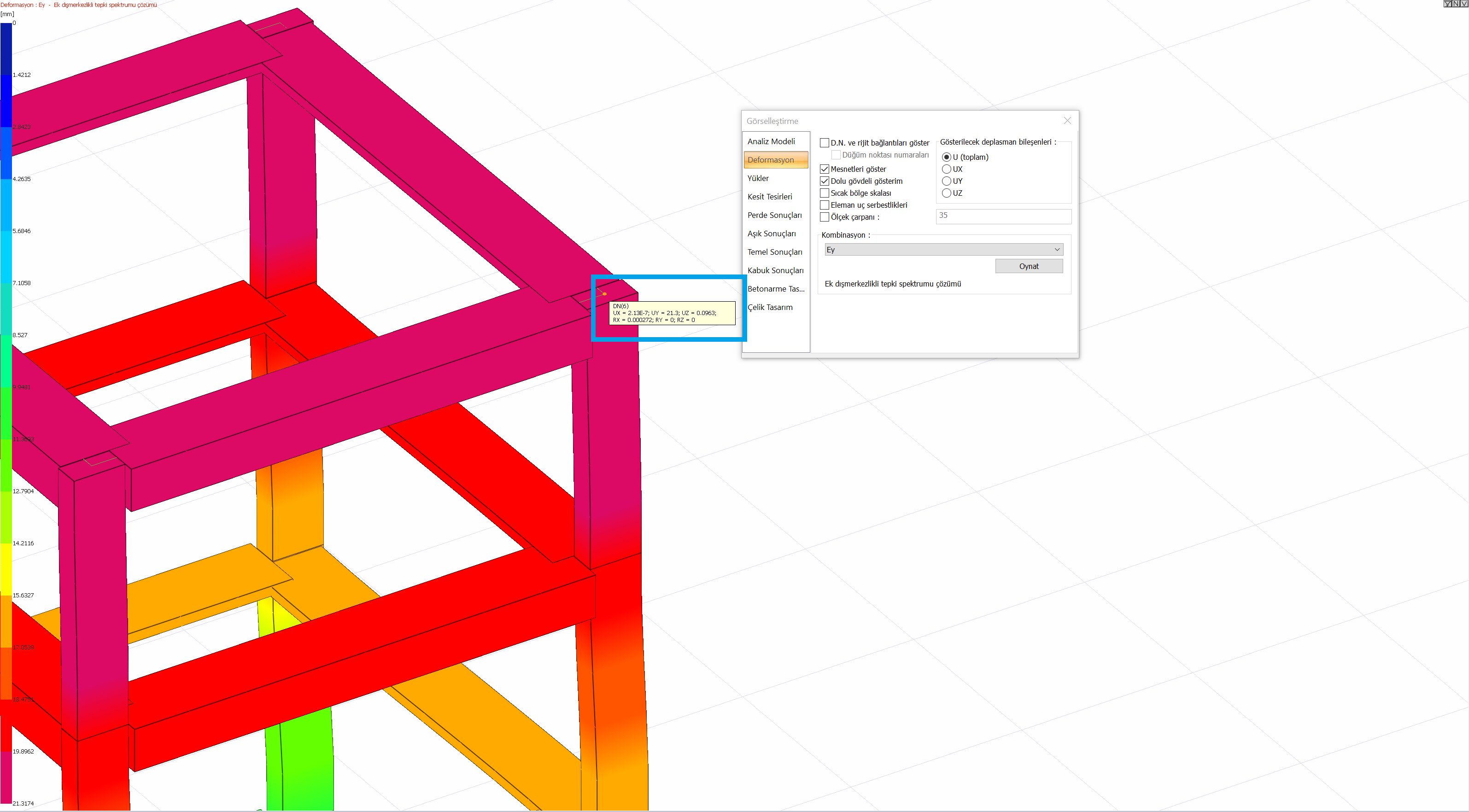 Benzer bir karşılaştırma iç kuvvetler için de yapılabilir. Ekdışmerkezlik etkisi olmadan R=D=I=1 olarak hesaplanan Ey yönündeki modal analiz sonuçlarında en alt kolonlarda çıkan M2 momenti değeri 5.644 tfm olarak görülmektedir.