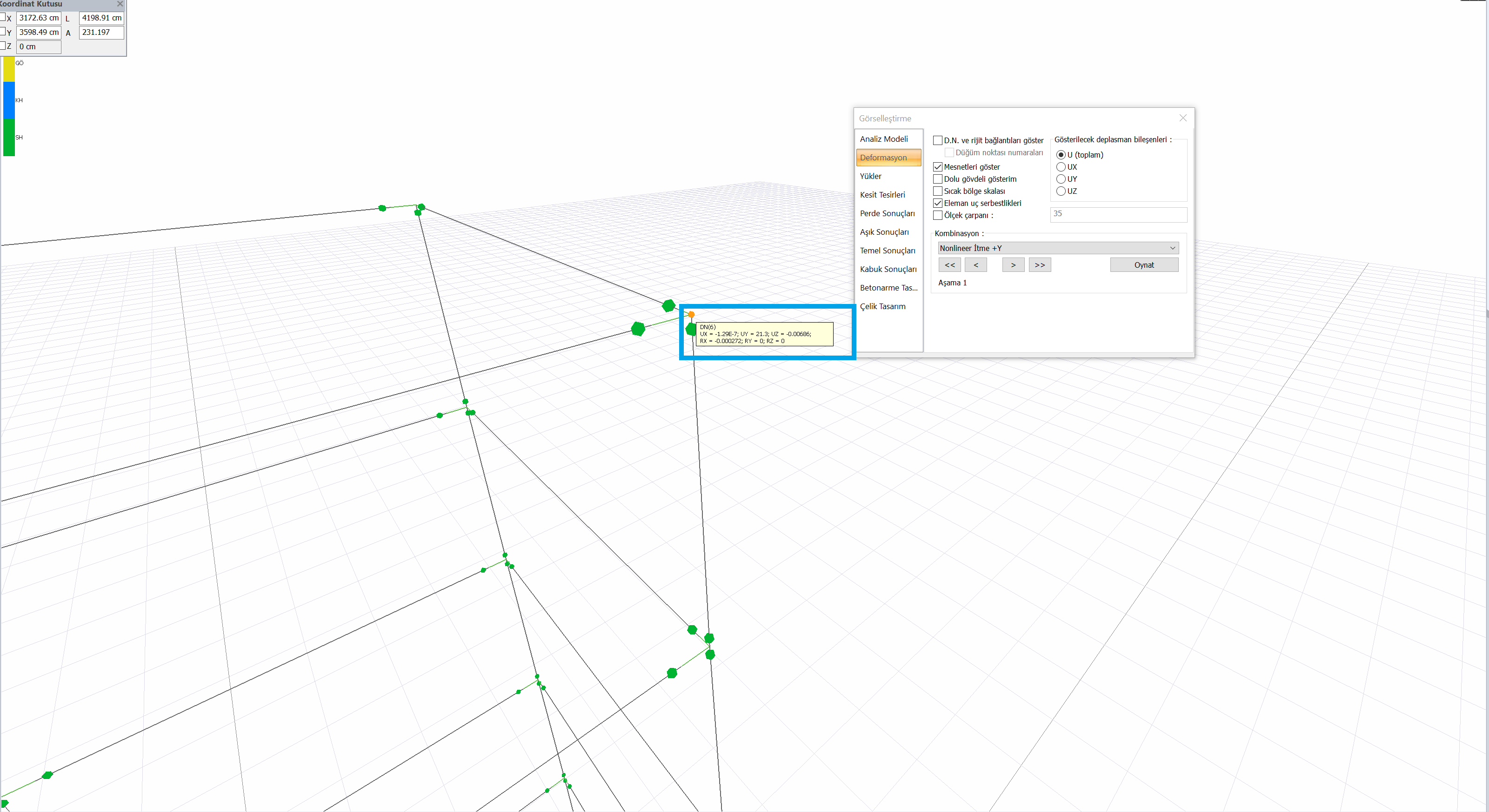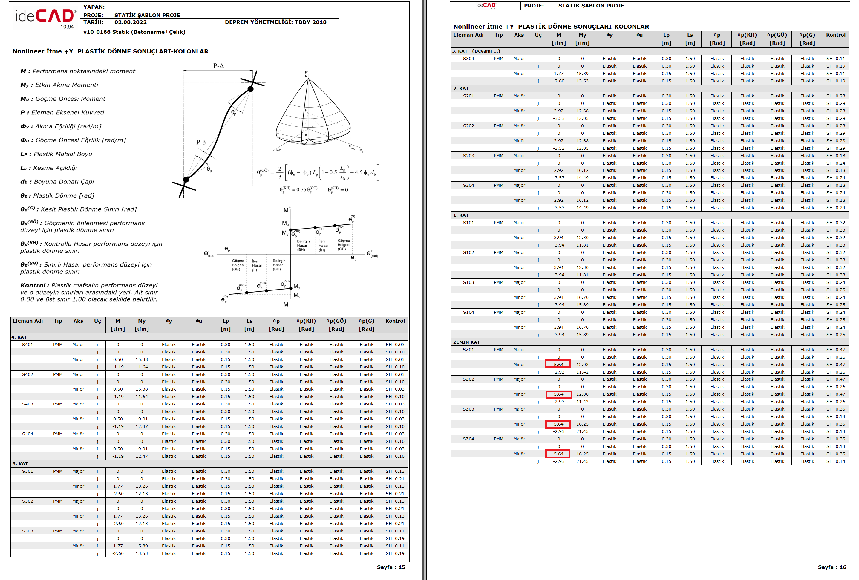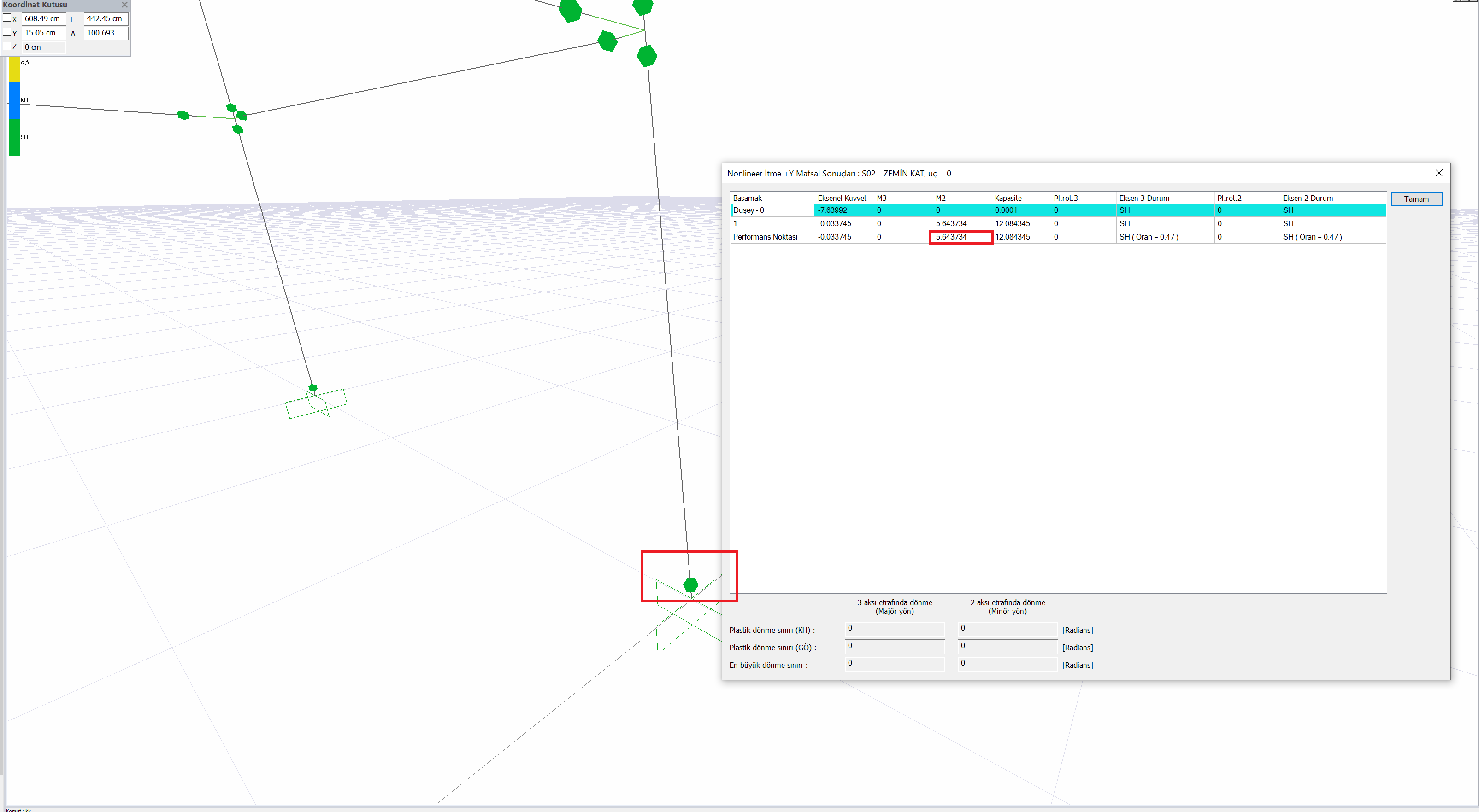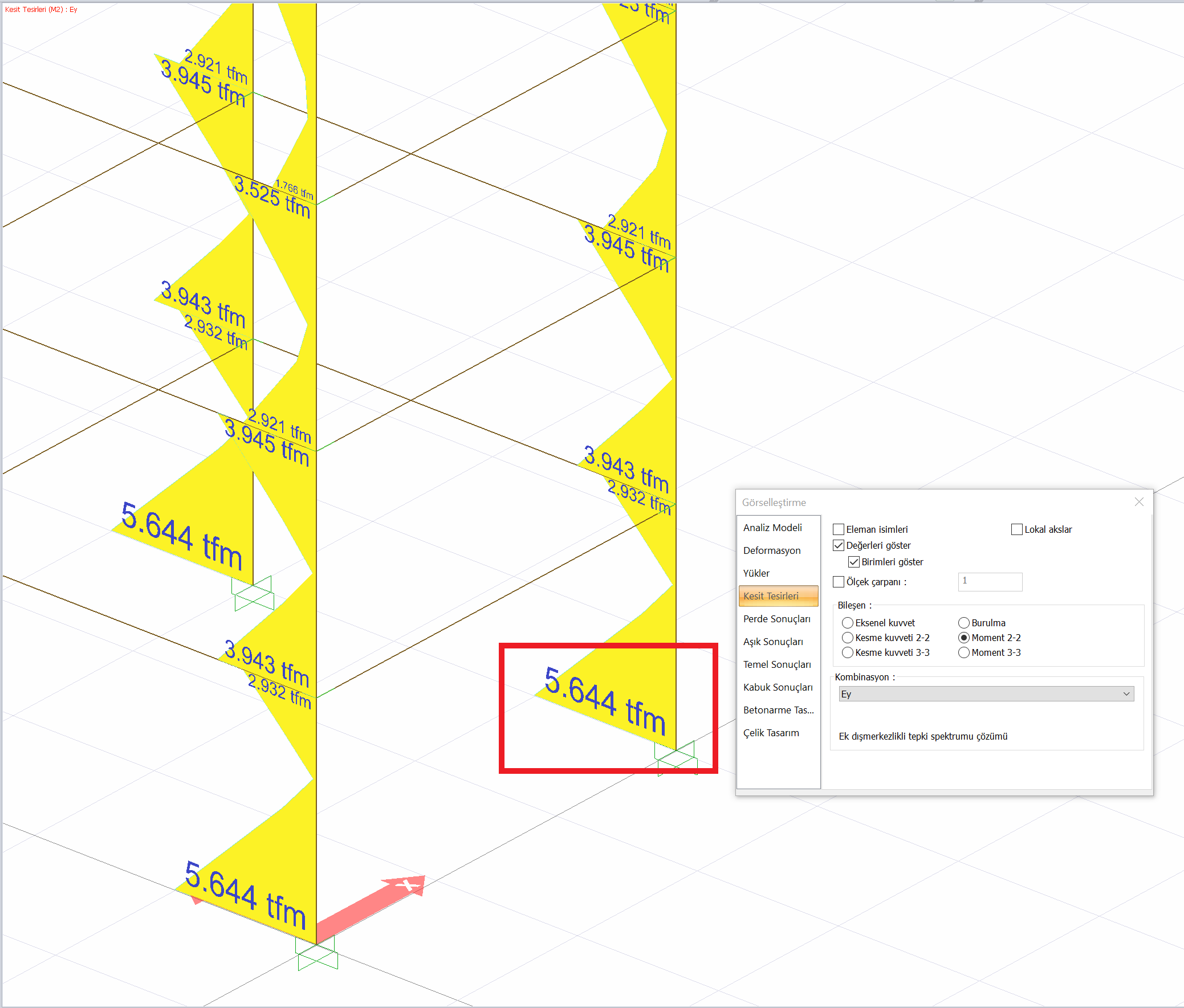 Hesap raporlarında Y yönündeki M2 momenti değerinin 5.644 tfm olduğu ve yerdeğiştirme değerinin 21.32 mm olduğu görülmektedir.