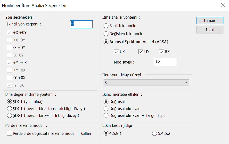 ARSA yöntemi ile yapılan itme analizinin birinci adımında başlangıç rijitlikleri kullanılarak doğrusal modal analiz yapılır.