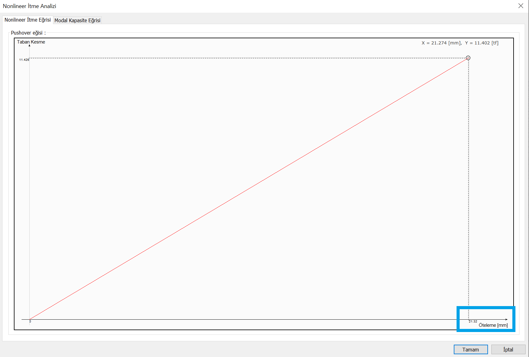 Ayrıca Y yönünde itme eğrisine bakıldığında 21.3 mm değerinde performans noktasına ulaşıldığı görülmektedir.