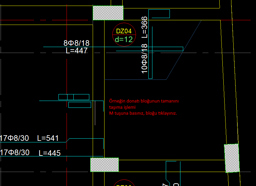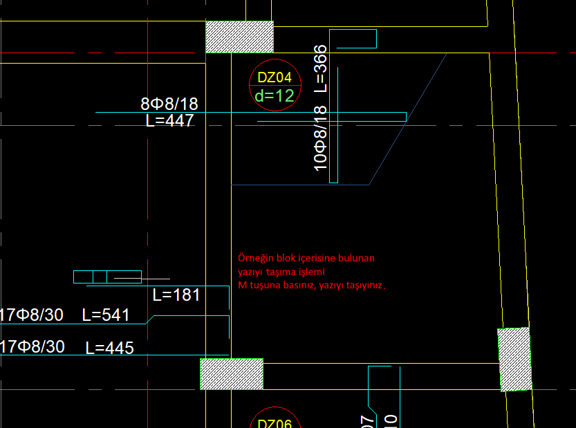 Örneğin Blok içerisindeki donatı yazısı tıklanırsa, sadece donatı yazısı taşınır. Eğer donatı çizgisi tıklanırsa, blok olarak donatı çizimi ile birlikte donatı yazılarının tamamı taşınır.