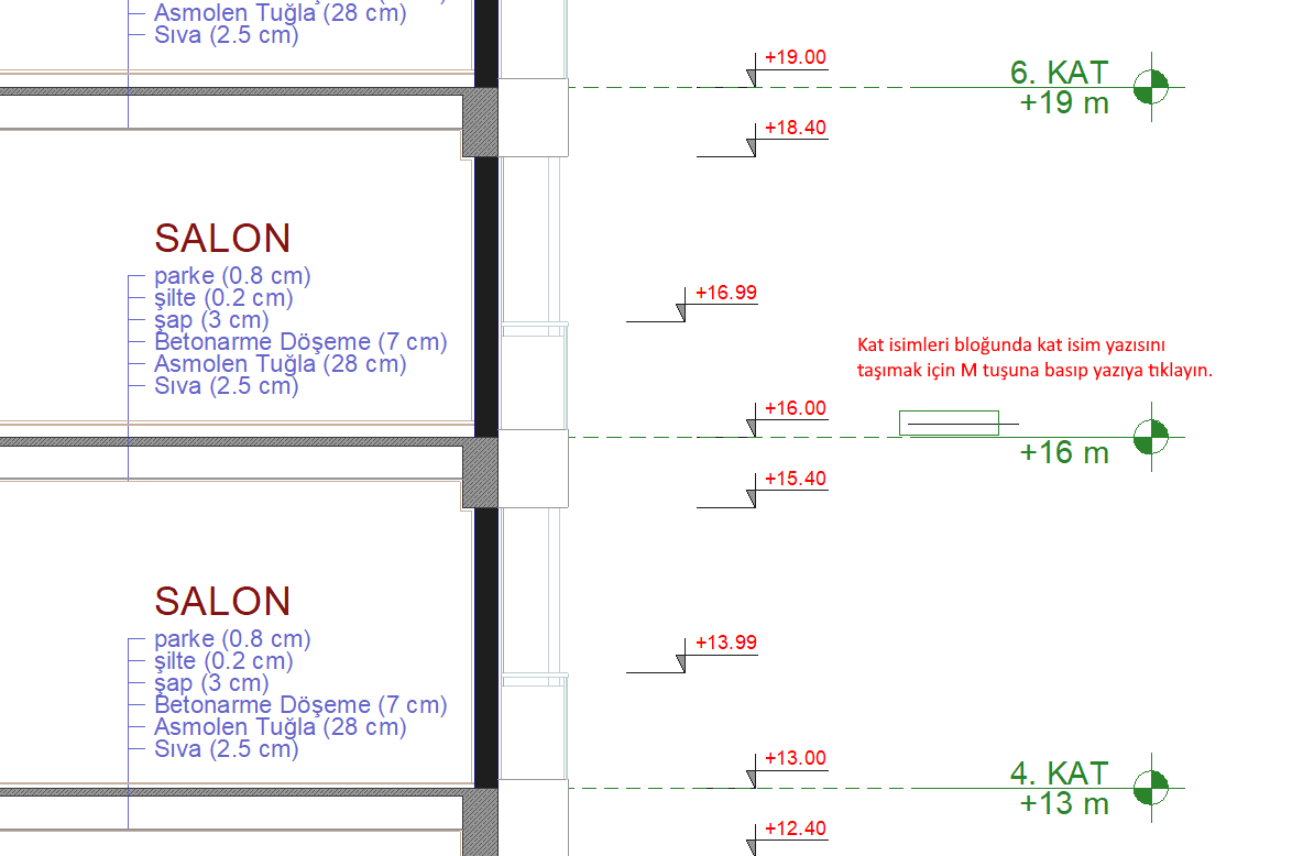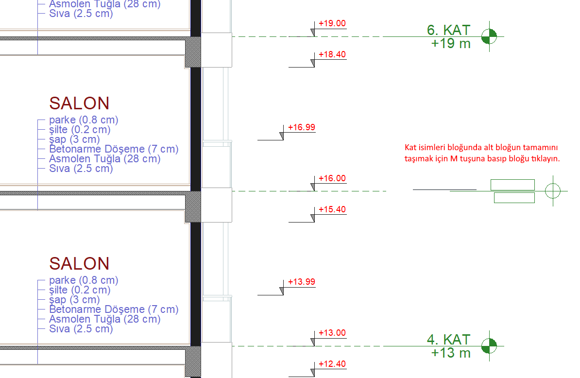 Örneğin kesitiniz de kat isimleri bloğunuzdan kat ismine tıklarsanız sadece tıkladığınız kat isim yazısı taşınır. Eğer çizgiye tıklarsanız çizginin ait olduğu kat isim yazısı ve çizimleri ile birlikte alt bloğun tamamı taşınır.
