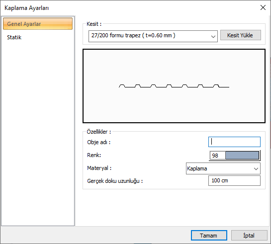 Kesit ![]() Kullanılan profil görünür. Listeyi tıklayarak daha önceden tanımlanmış profillerden biri seçilebilir ya da Kesit Yükle butonu tıklandığında açılan diyalogdan yeni bir profil seçilebilir. |