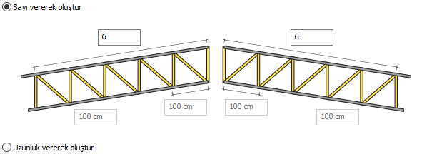 Uzunluk vererek oluştur ![]() Uzunluk değeri, iki örgü arasındaki mesafedir. Her iki eğim için ayrı değerler verilebilir. Uzunluk vererek oluştur işaretlendiğinde, makasın örgü sayısı, makas açıklığa bağlı olarak bulunur. Ayrıca tepe noktası sol ve sağ başlangıç gözlerinin uzunlukları da ayrı olarak düzenlenebilmektedir. Toplam uzunluk, Uzunluk sekmesinde düzenlenir. |
