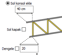 ![]() Sol konsol ekle bölümünden makasın sol üst ve alt başlıklarına farklı değerler vererek konsol eklenir. Dengele seçeneğini işaretleyerek alt başlığa verilen değer üst başlığa da uygulanır. Sol kapak seçeneği işaretlenerek konsolun ucuna kapak eklenir. |