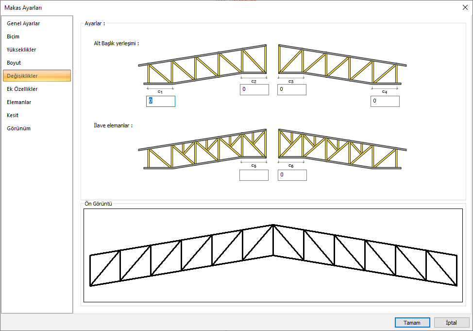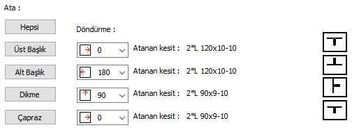 Kesit ayarları ![]() Ata bölümünden listeden seçilen kesitin makas elemanlarına bu bölümden atanır. Hepsi butonu tüm makas elemanlarına seçilen kesit atanabileceği gibi, Üst Başlık, Alt Başlık, Dikme ve Çapraz butonlarından biri tıklanarak sadece o elemana kesit atanabilir. |