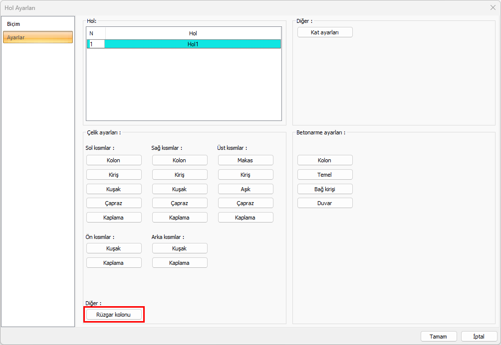 Hol çelik rüzgar kolonu ayarları, hol ayarları diyaloğu ayarlar sekmesinden Çelik Rüzgar Kolonu butonu tıklanarak değiştirilir.
