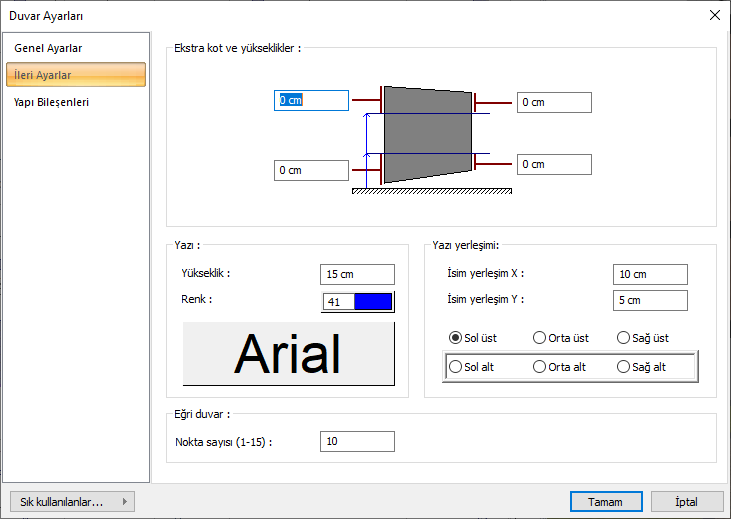 Ekstra kot ve yükseklikler ![]() Duvar şeklinin dört köşesinde bulunan kutucuklara değerler girilerek duvar uçları yükseltilip alçaltılabilir. |
