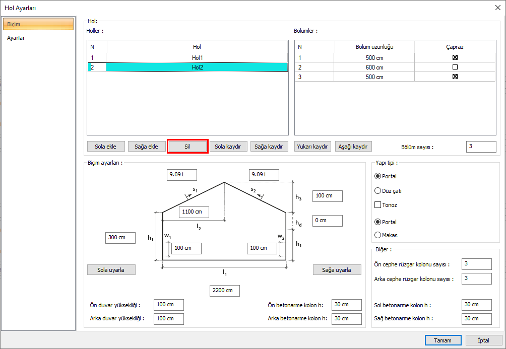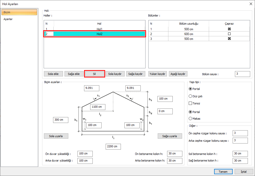 Sil butonu tıklanarak hol ayarları diyaloğunda seçilen hol silinir.
