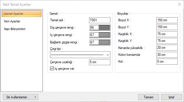 Yükseklik | Malzeme tanımlanırken bulunan uzunluk ölçüsü ile tekil temelin yüksekliği çarpılarak, malzemenin uzunluğu bulunacak demektir. | |
