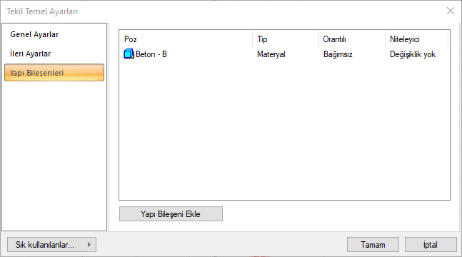 Oranla listesinde tekil temel objesi ve malzeme ölçüsüne göre beliren satırlar şunlardır.