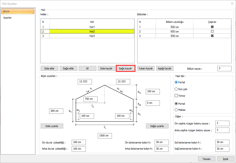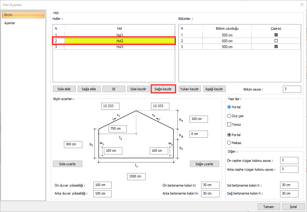 Sağa kaydır butonu tıklanarak hol ayarları diyaloğunda seçilen holün yeri, sağ yanında yer alan holünkiyle değiştirilir.