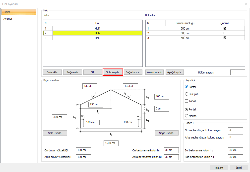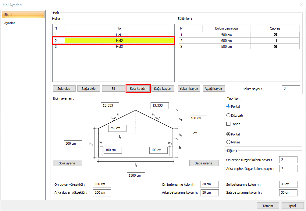 Sola kaydır butonu tıklanarak hol ayarları diyaloğunda seçilen holün yeri, sol yanında yer alan holünkiyle değiştirilir.
