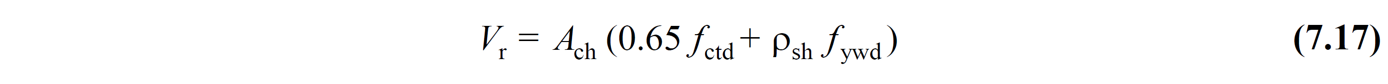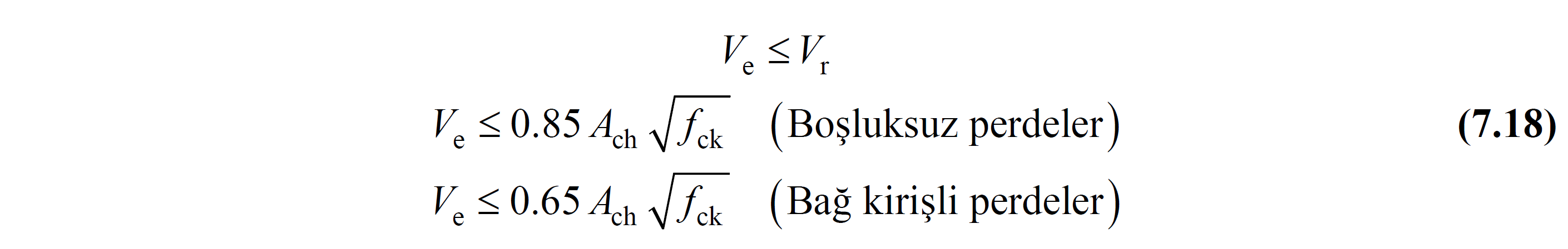TBDY 5.8.1.5 ve 7.6.6.3 'e göre bir kolonun sünek davranış gösterebilmesi için, kolonların performans noktasında oluşan kesme kuvveti değeri Ve 'nin, kiriş kesme kuvveti dayanımı Vr den küçük olması gerekmektedir. Perdelerde kesme kuvveti dayanımı Vr TBDY Denklem 7.17 ile bulunmaktadır. Perde kesme kuvveti dayanımı Vr 'nin bulunması Perde Kesitlerinin Kesme Dayanımı Hesabı başlığı altında detaylı şekilde anlatılmıştır. Yeni yapılacak binalar için Vr hesaplanırken Tablo 5.1 'de verilen ortalana (beklenen) malzeme dayanımları esas alınır. Mevcut binalar için Vr hesaplanırken Tablo 15.1 'de verilen mevcut malzeme dayanımları ve Bilgi Düzeyi Katsayıları kullanılır.
