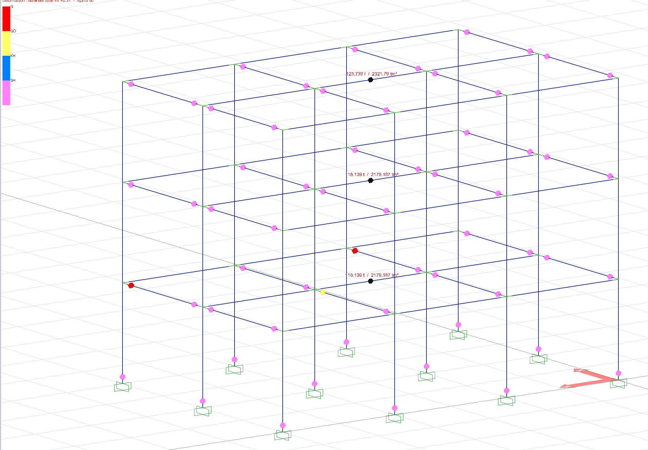 Mevcut yapılarda şekildeğiştirmeye göre değerlendirme ve tasarım (ŞGDT) yaklaşımı ile Doğrusal olmayan yöntemler kullanılıyor ise taşıyıcı sistem modelinde tanımlanan çubuk sonlu elemanların uygun yerlerine plastik mafsallar tanımlanır. Herhangi bir kesit akma momenti değerine ulaştığında taşıyıcı sistem modeli değiştirilerek diğer adımlara yeni taşıyıcı sistem modeli ile devam edilir. Aşağıdaki resimde plastik mafsalların tanımlandığı çubuk sonlu elemanlardan oluşan üç boyutlu bir taşıyıcı sistem gösterilmiştir.