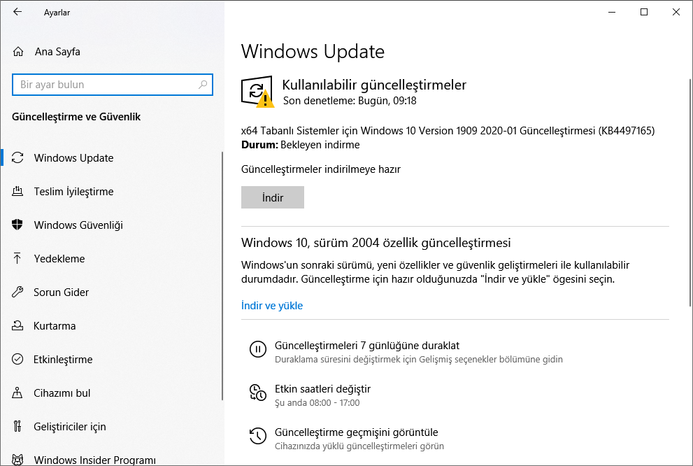 Windows da, Başlangıç > Ayarlar > Güncelleştirme ve Güvenlik > Windows Update 'e gidiniz.