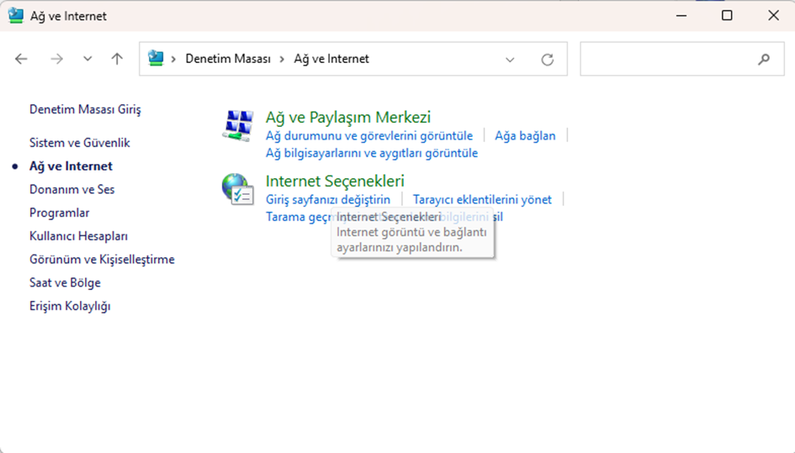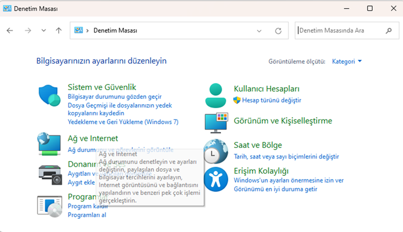 Denetim Masası diyaloğundan Ağ ve İnternet satırını tıklayın.