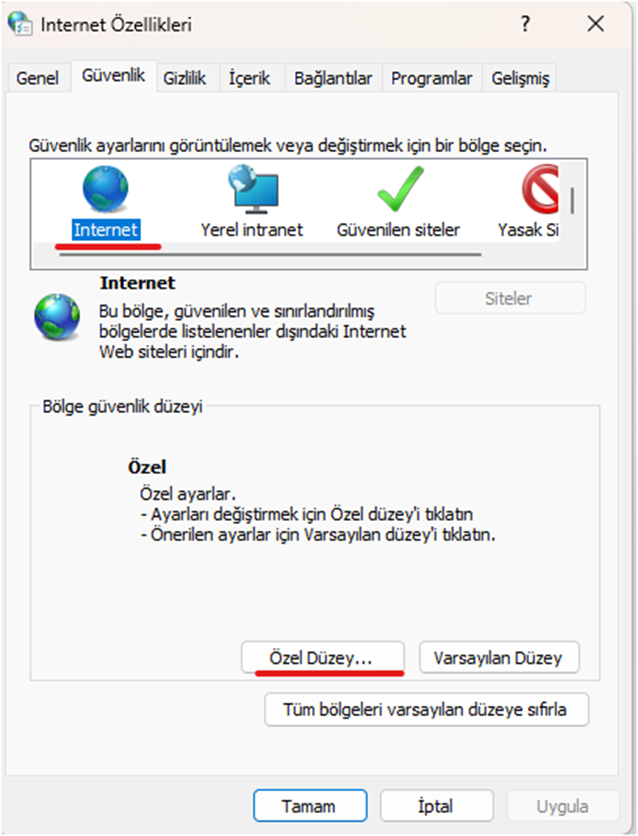 Güvenlik sekmesinden İnternet bölgesini seçip Özel Düzey butonunu tıklayın.