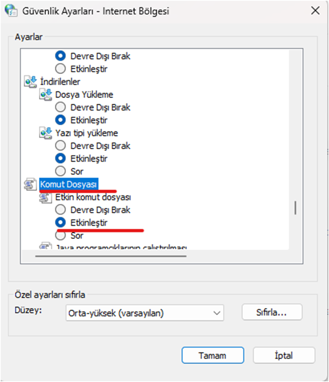 Komut Dosyası satırını bulup, Etkinleştir seçeneğini işaretleyin.