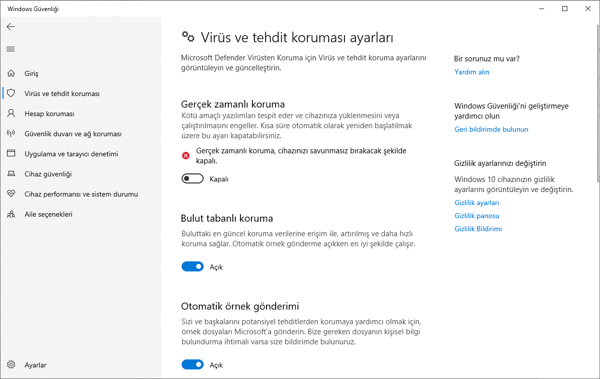 Gerçek zamanlı korumayı Kapalı konumuna getiriniz.